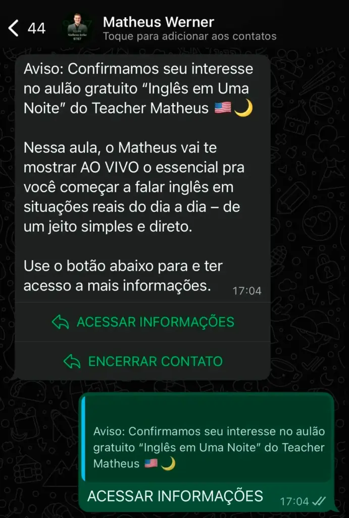 Ao confirmar sua inscrição e entrar no Grupo de Interessados, você receberá uma mensagem automática do nosso número oficial.