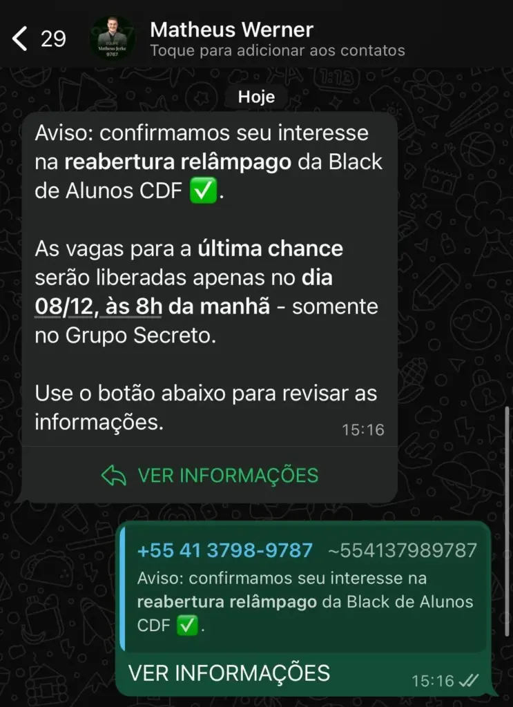 Ao confirmar sua inscrição e entrar no Grupo de Interessados, você receberá uma mensagem automática do nosso número oficial.