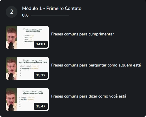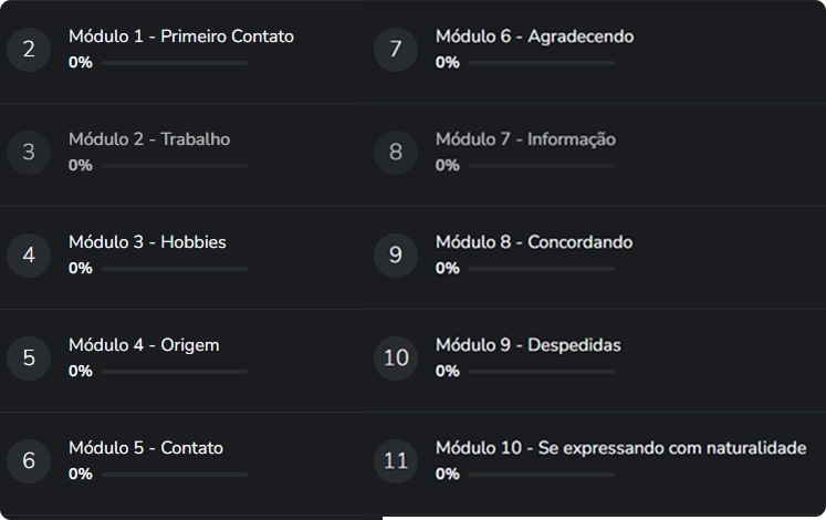 Você vai desbloquear seu inglês básico em 10 situações essenciais do dia a dia, com um módulo exclusivo para cada situação.